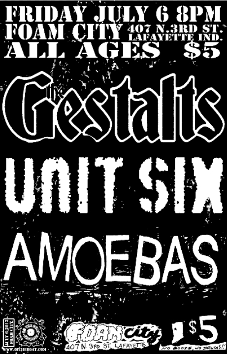 Oi! the Boat Records presents THE GESTALTS and UNIT SIX (miami) and the AMOEBAS (michigan) at FOAM CITY for an all ages crowd. 8 to 11. Only 5 bones! The young and old can fit this between dinner and bed. The bar folk can fit this between bed and the bar. Easy as pie. Not to be missed!